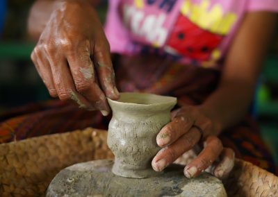 Although they are known as the sanan rai group, the true name of the group is Hakusara, which means “Haburas Kultura Sanan Rai.” It was established in 2013 and is now composed of about 30 women who continue to produce a variety of products such as pots, cups, plates, lamps, candleholders and clay statues in a variety of forms.